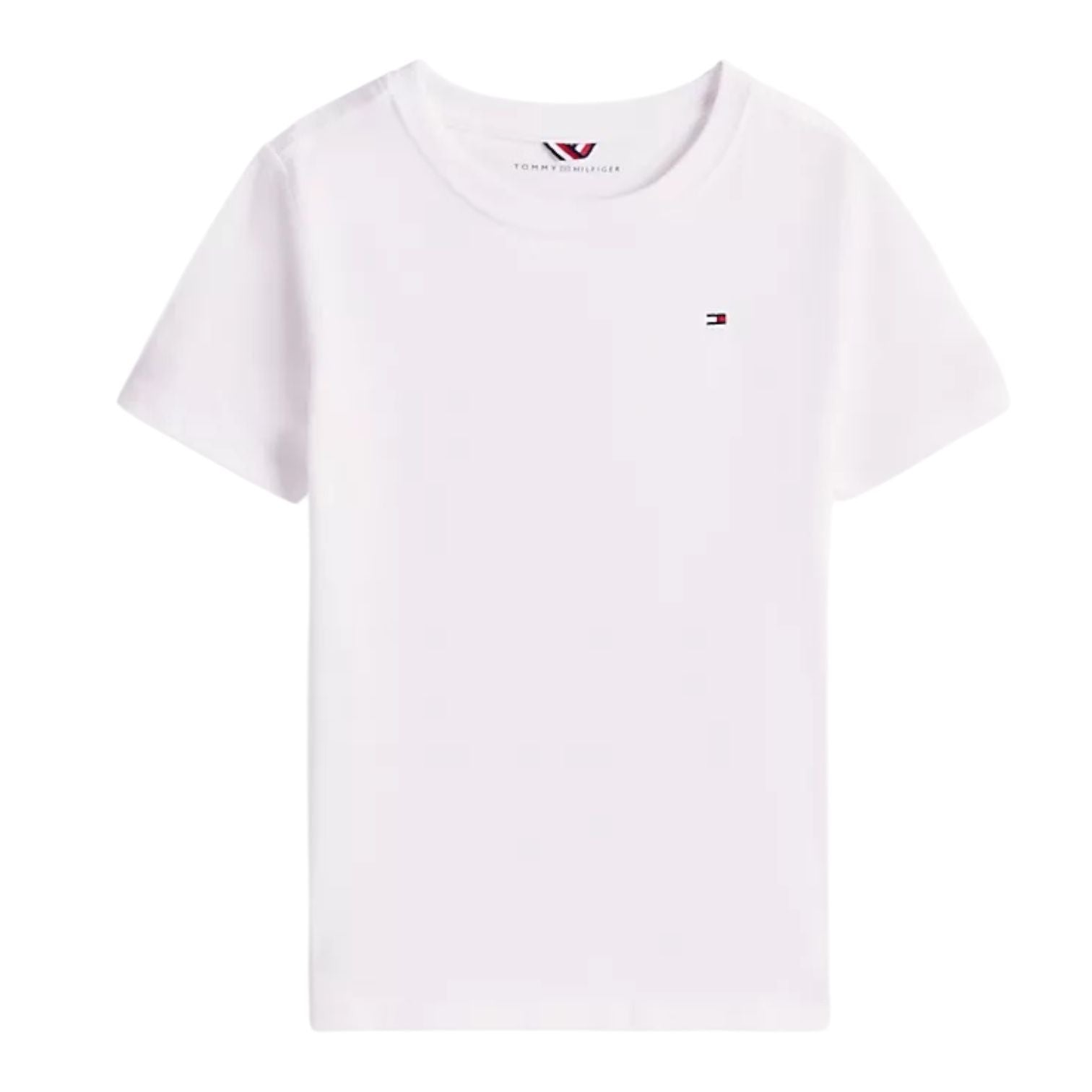 Camiseta infantil confeccionada en algodón suave y de alta calidad, diseñada para ofrecer conforto y un estilo limpio y moderno. Su color blanco clásico permite combinarla fácilmente con shorts, jeans o faldas, mientras el icónico logo de Tommy Hilfiger aporta un toque elegante y atemporal al look.