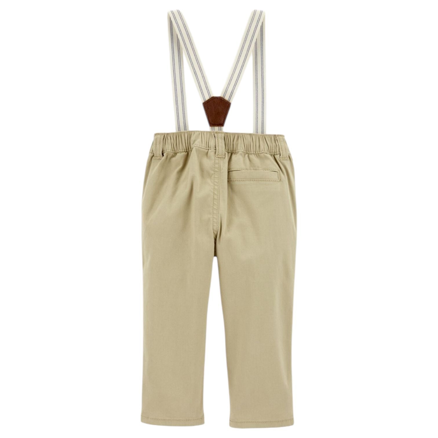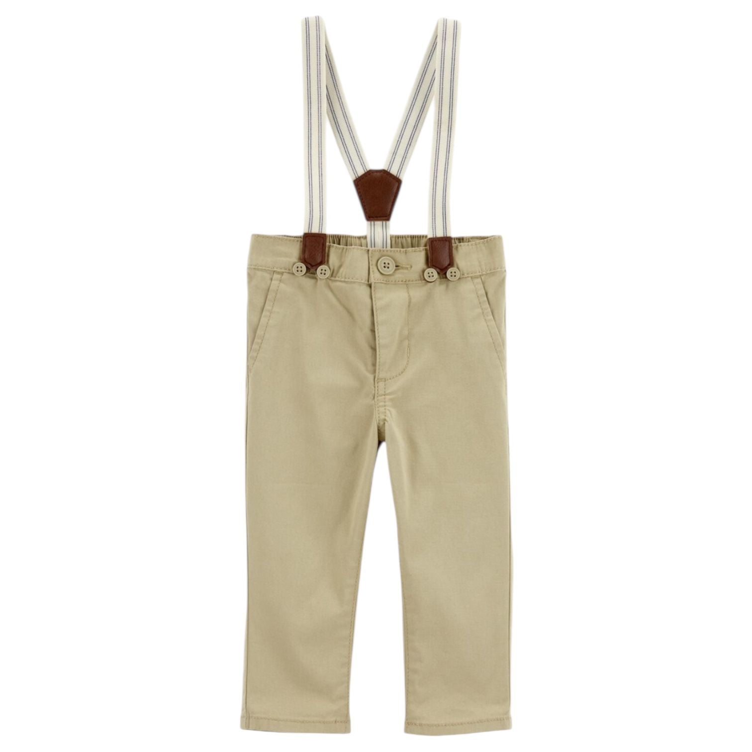 Pantalón de sarja en color marrón diseñado especialmente para bebés, acompañado de un suspensorio ajustable que aporta estilo y funcionalidad. El tejido suave y resistente ofrece comodidad durante todo el día, ideal para mantener al bebé bien vestido en cualquier ocasión.
