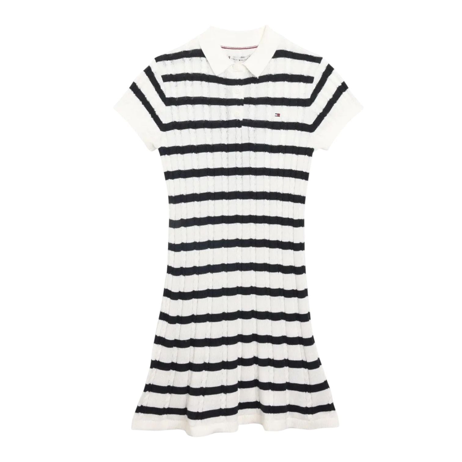 Vestido infantil confeccionado en tejido tricotado de alta calidad, con diseño de rayas al estilo navy que aporta elegancia, modernidad y un toque clásico característico de Tommy Hilfiger. Su estructura tipo polo con cuello y mangas cortas ofrece un look refinado, mientras el tejido elástico y cómodo garantiza libertad de movimiento y un ajuste perfecto.